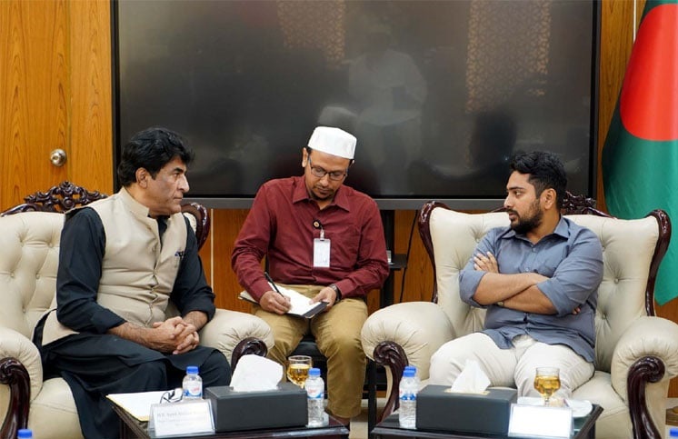 ঢাকায় নিযুক্ত পাকিস্তানের হাইকমিশনার সৈয়দ আহমদ মারুফ তথ্য ও সম্প্রচার মন্ত্রণালয় এবং ডাক টেলিযোগাযোগ ও তথ্য প্রযুক্তি মন্ত্রণালয়ের উপদেষ্টা মো. নাহিদ ইসলামের সাথে আজ সচিবালয়ে তার দপ্তরে সাক্ষাৎ করেছেন।